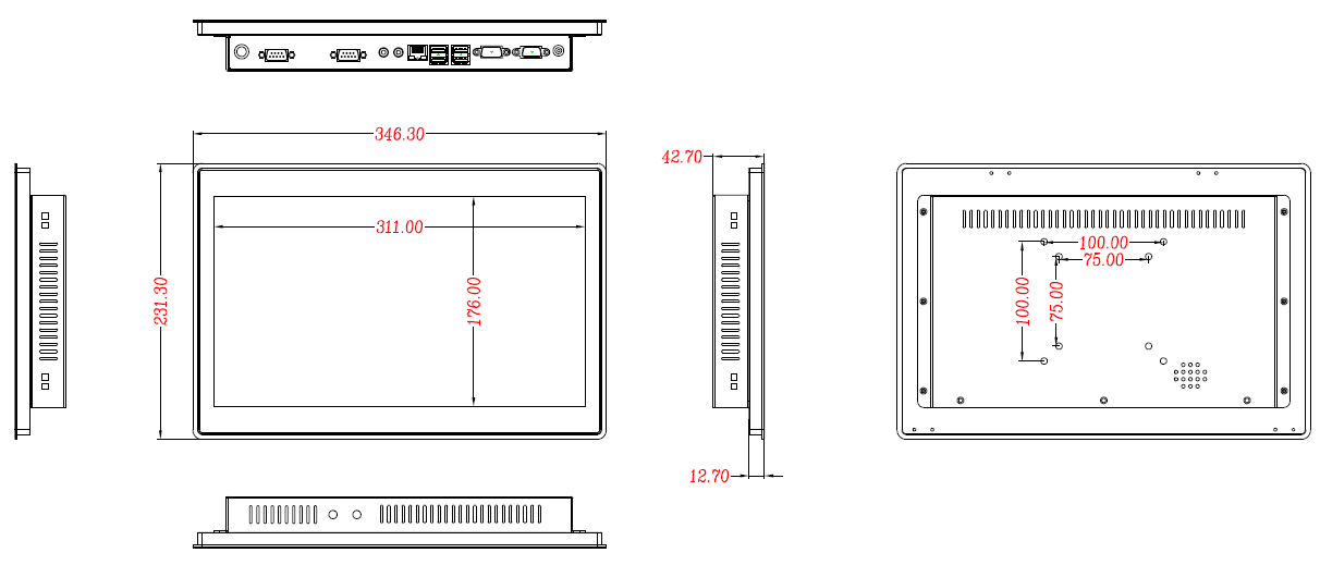 標配2 x RS232,4 x USB 2.0,1 x VGA,1 x HDMI |